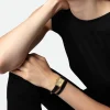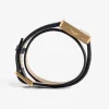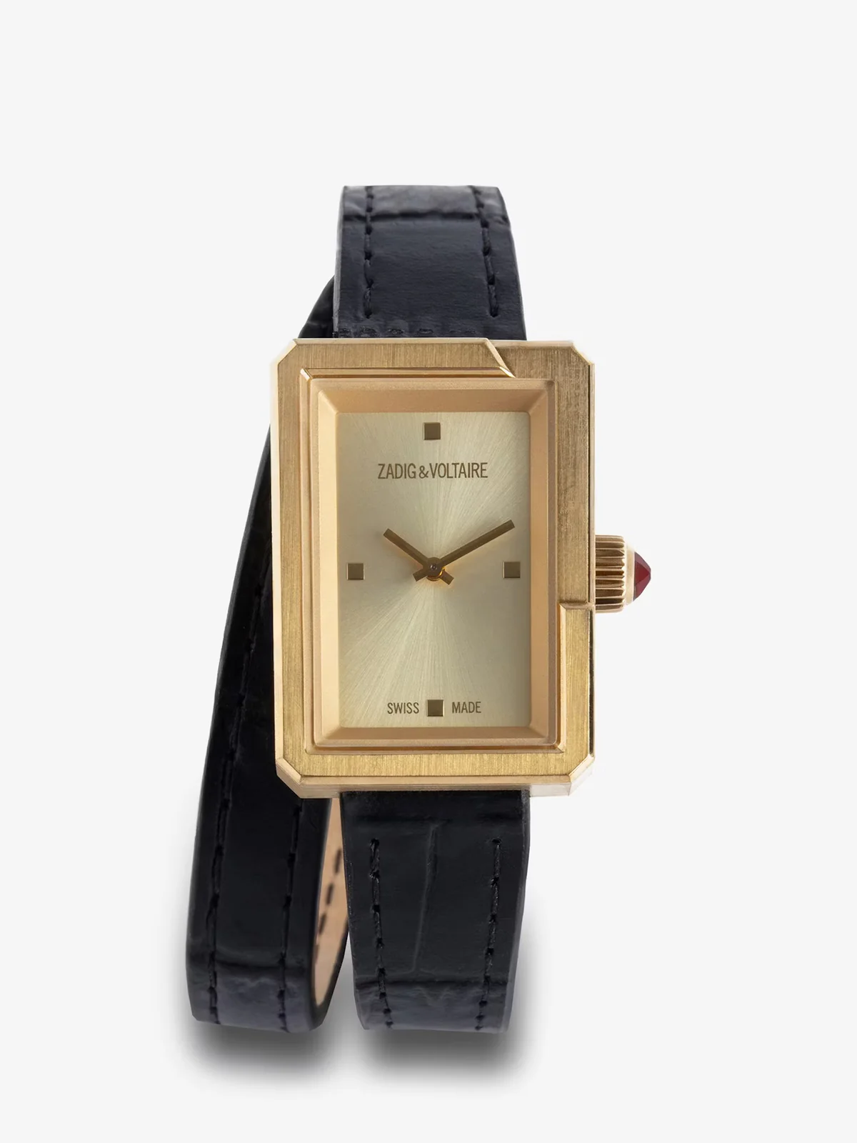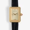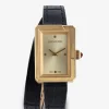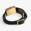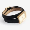 Women’s rectangular dial gold-tone watch with double wrap leather strap.