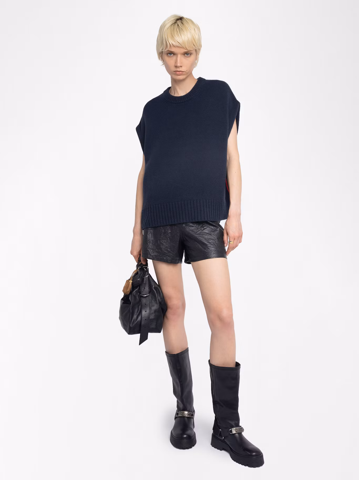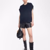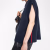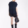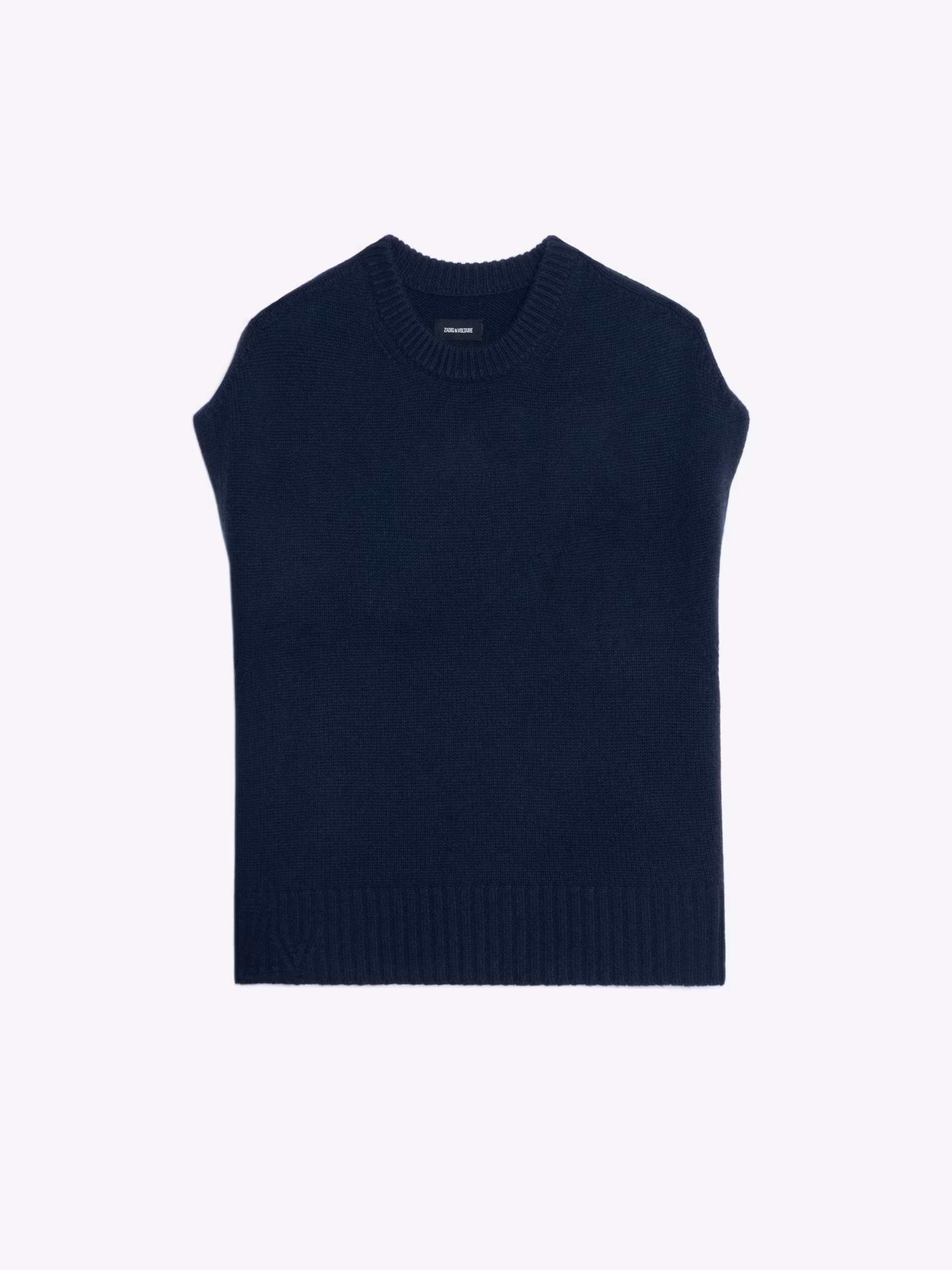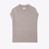 Sleeveless round neck sweater with contrasting outside linking on the sides.