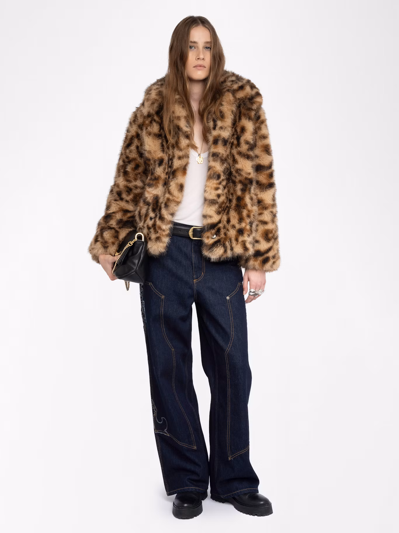 Leopard faux fur coat.