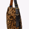 Leopard faux fur hobo bag with leather shoulder strap and signature wings.