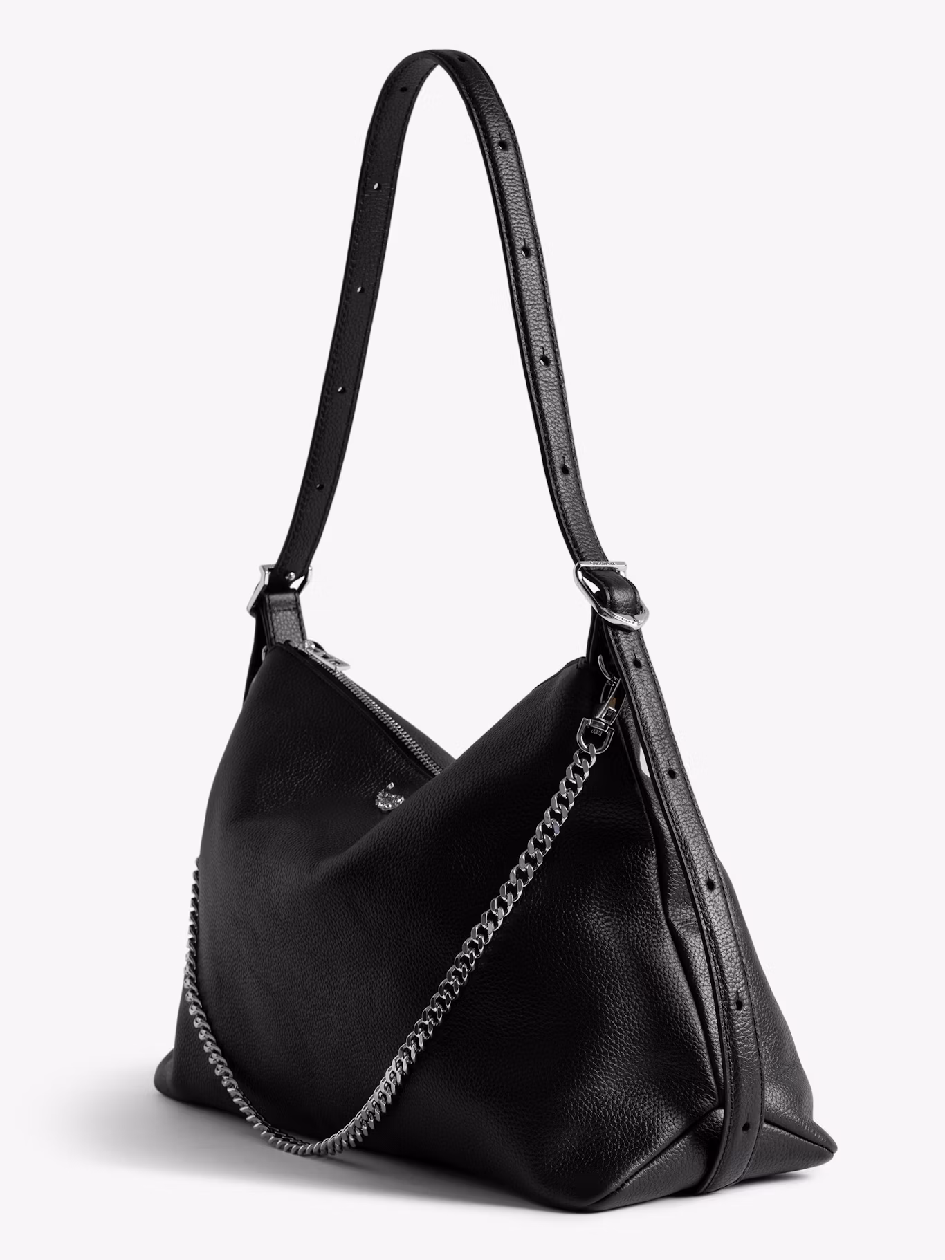 Sac souple en cuir grainé orné d’une chaine et d’une aile strassée.