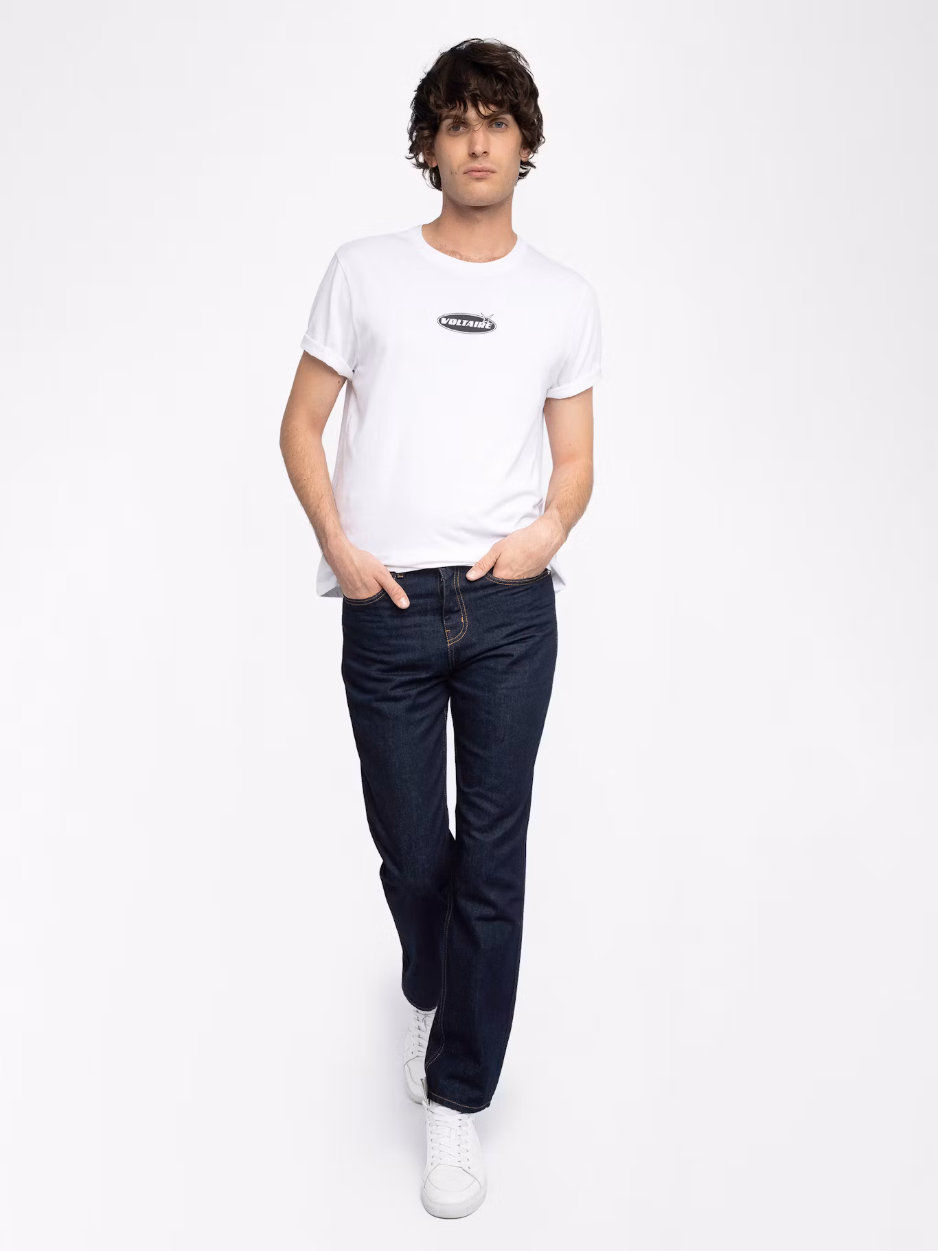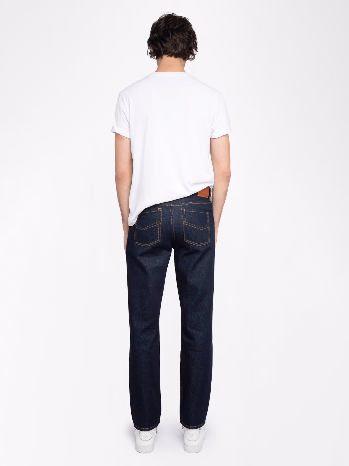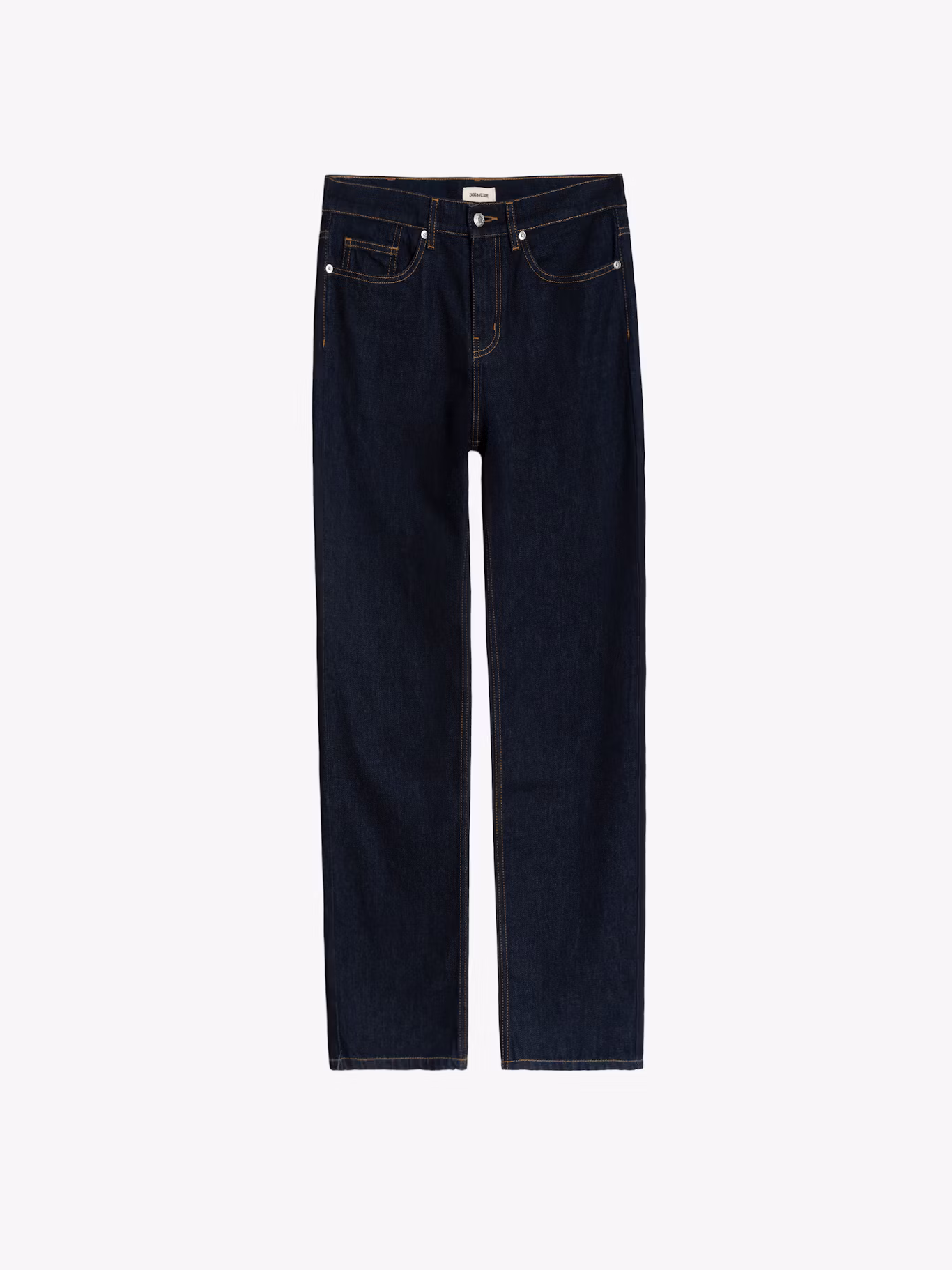 Raw straight jeans, zip closure.