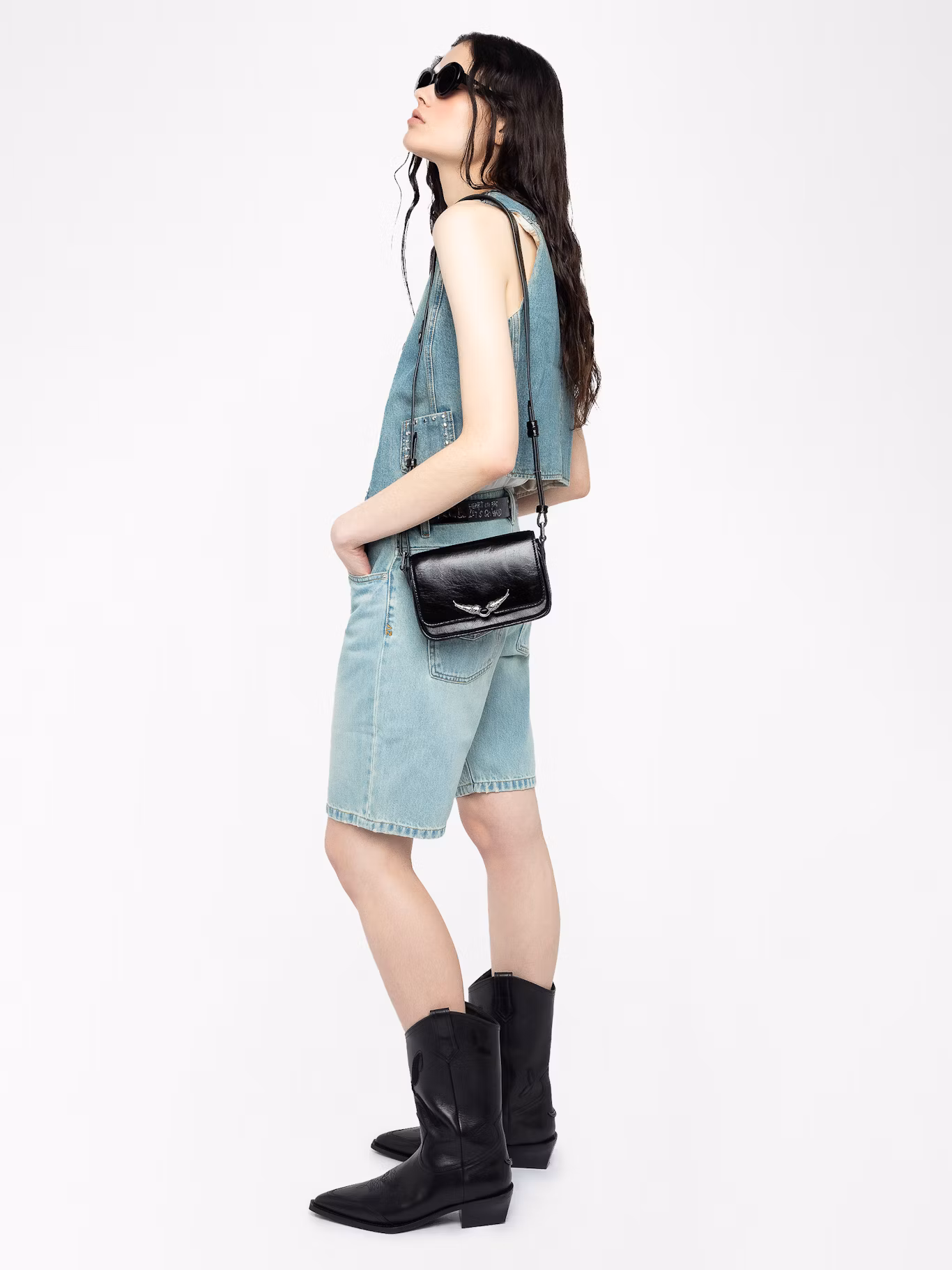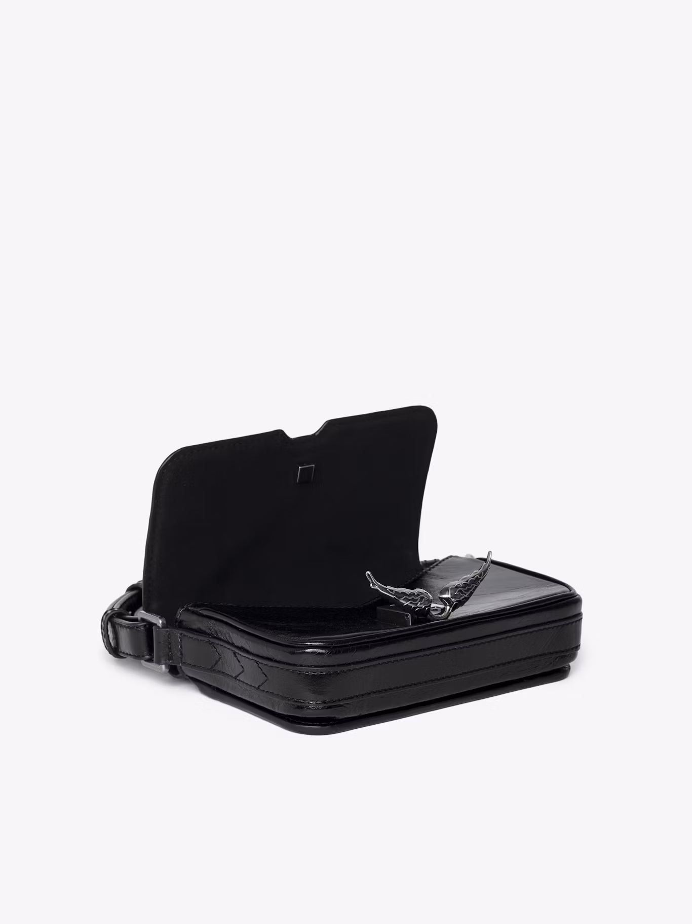Small patent leather bag inspired by vintage effect, adjustable shoulder strap and signature wings.