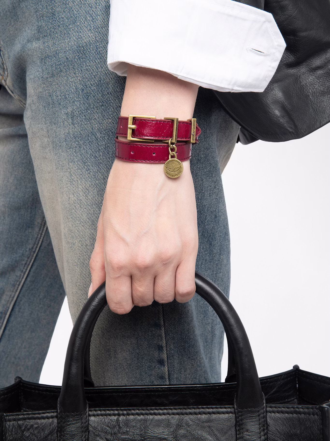 Bracelet en cuir vernis effet vintage double tour avec un charm médaillon.