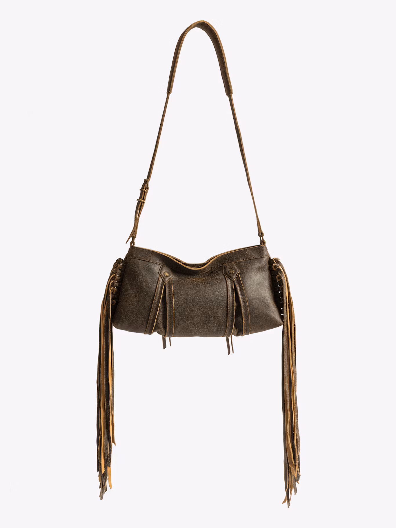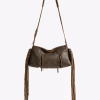 Vintage inspired leather bag with side fringes, adjustable shoulder strap, signature Zadig&Voltaire X Egonlab.