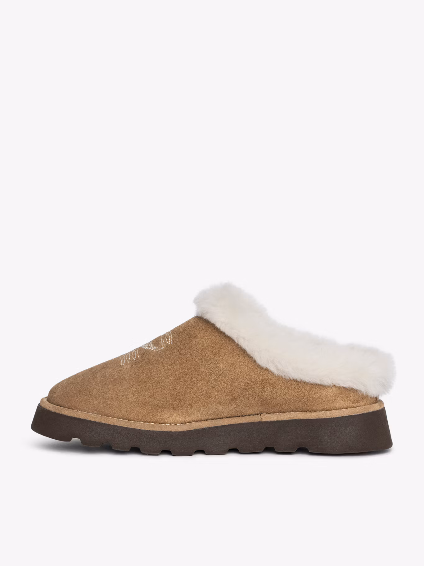 Suede and shearling mules decorated with signed embroidery.