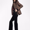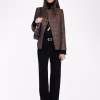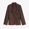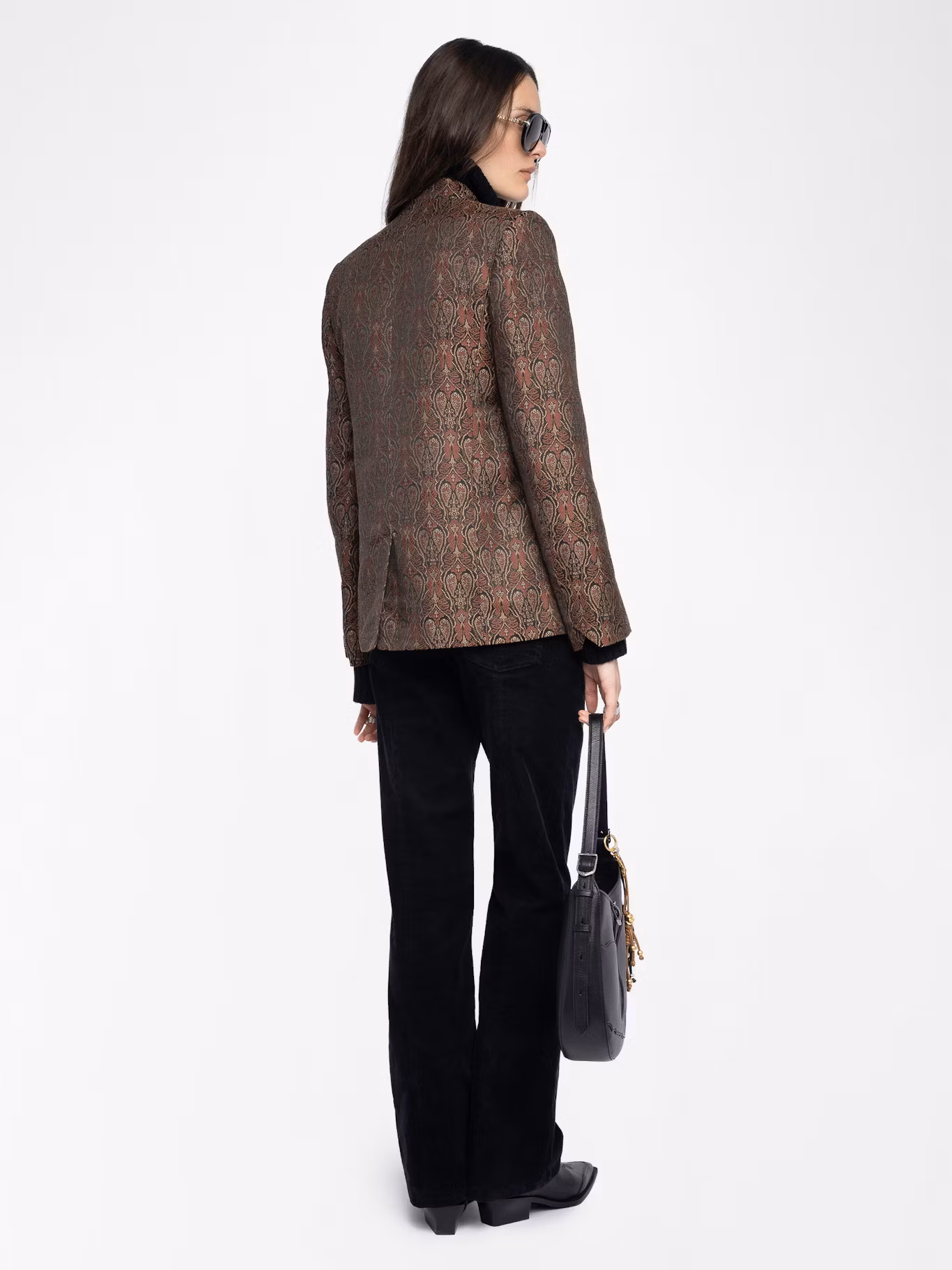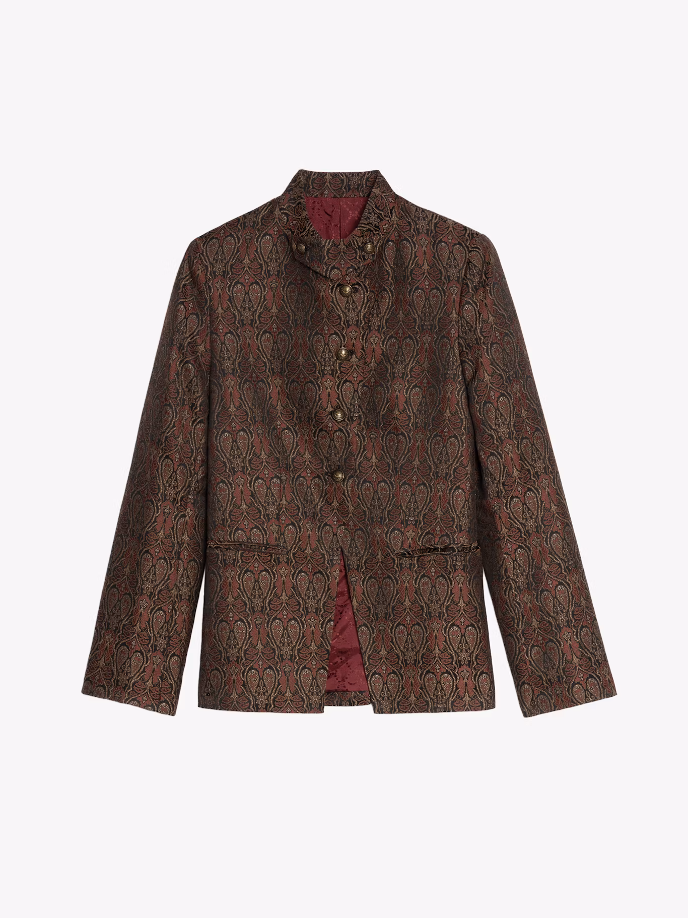 Straight structured blazer in jacquard, stand-on collar and sabutt embroidery pin, with button closure.