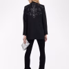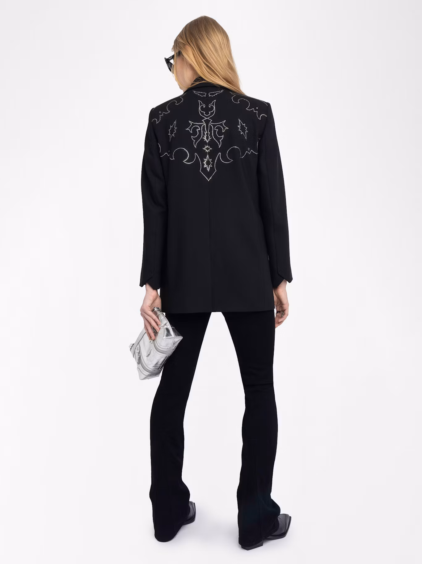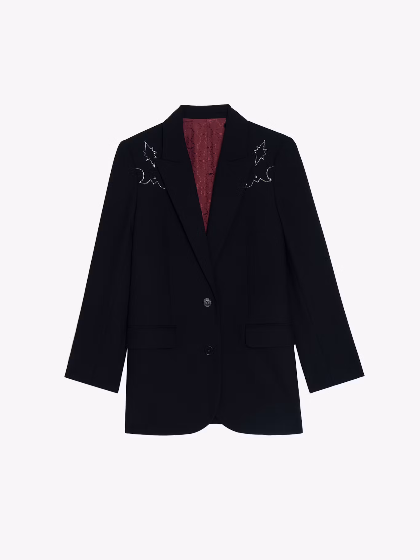 Straight blazer structured in a suit with western-style rhinestones and button closure.