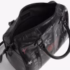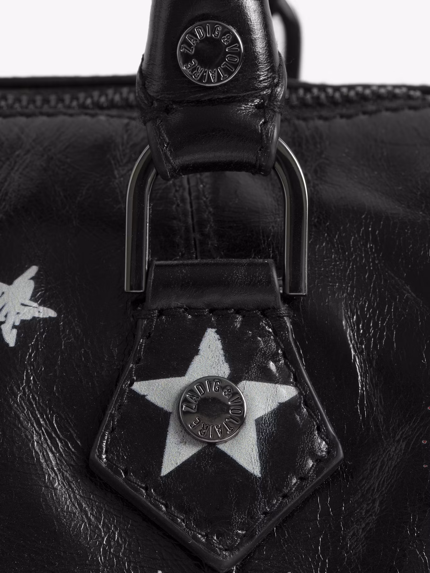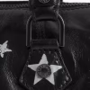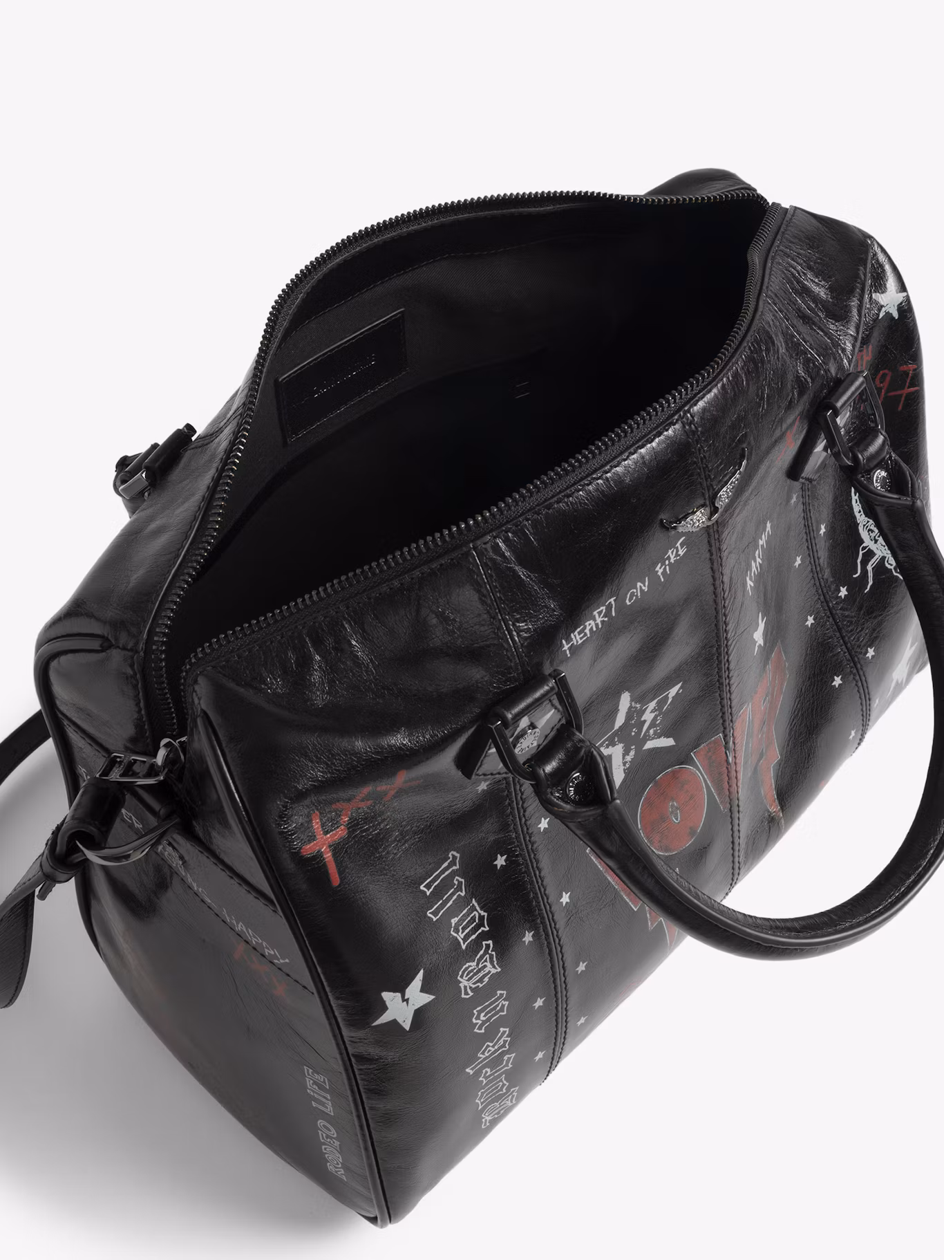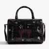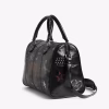 Vintage inspired patent leather mini bag with punk tag, adjustable shoulder strap and signature wings.