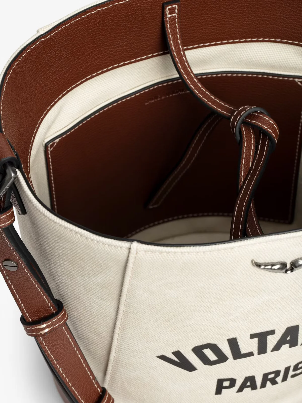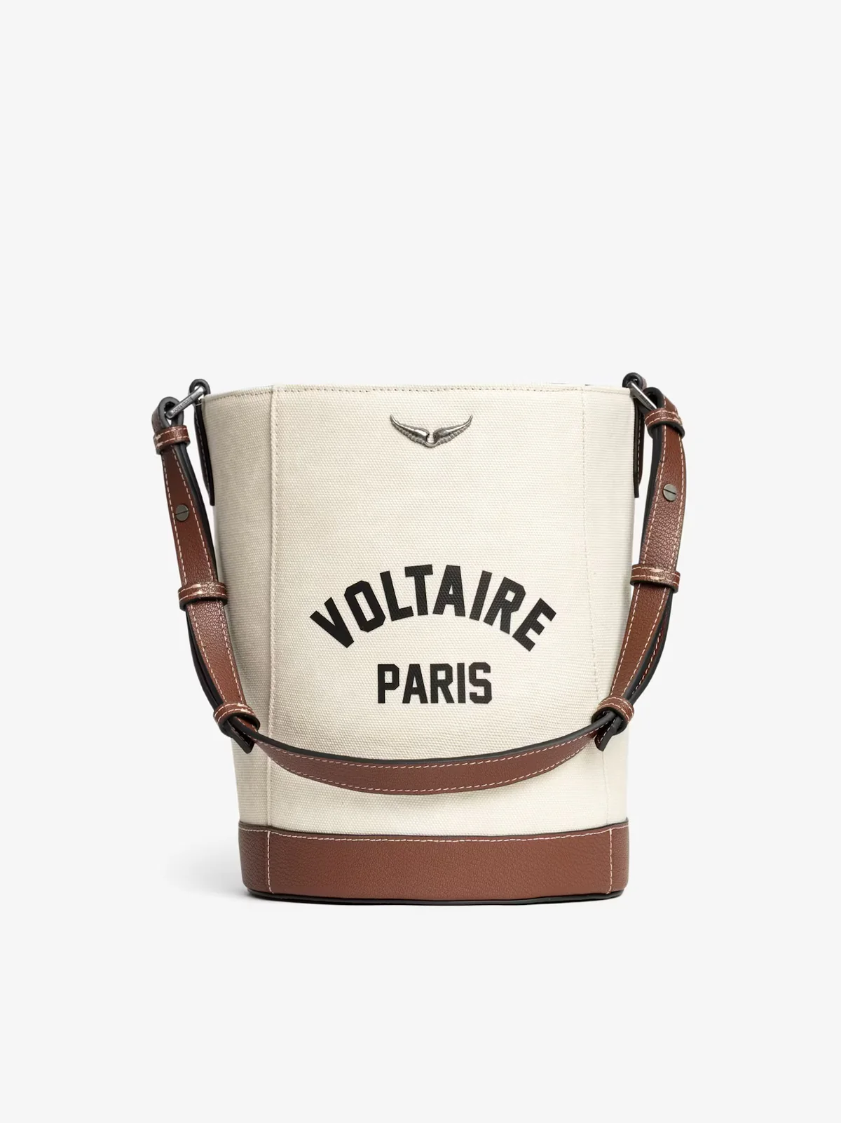 Canvas and grained leather bucket bag with adjustable strap and wing signature.